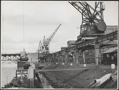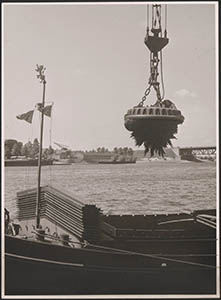 Het laden van bossen met draadstaal aan de loswal bij de …