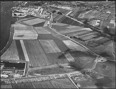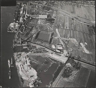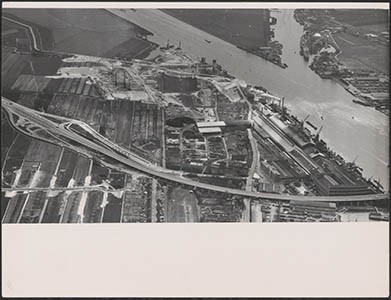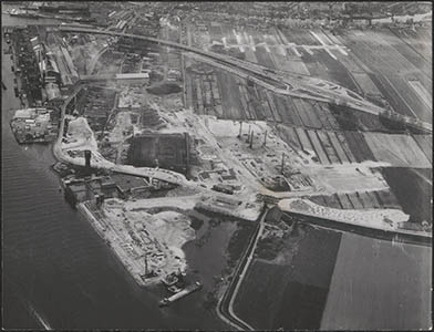 Luchtfoto van de kabelfabriek in Alblasserdam. Links in …