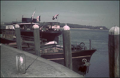 Afgemeerde rijnaken aan de Merwekade. Rechts is een …