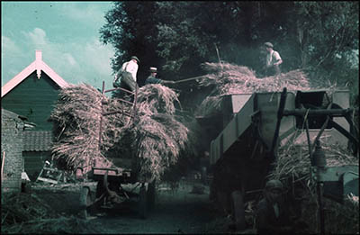 Boeren met hun wagens vol stro.