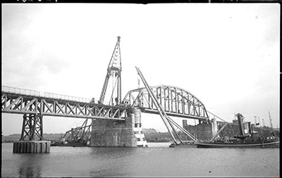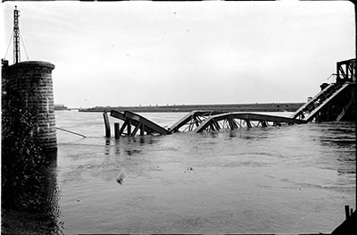 Bouw van de spoorbrug over de Maas in Mook.