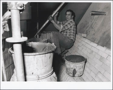 Een metselaar legt bekleding aan in de wervelbedoven van …
