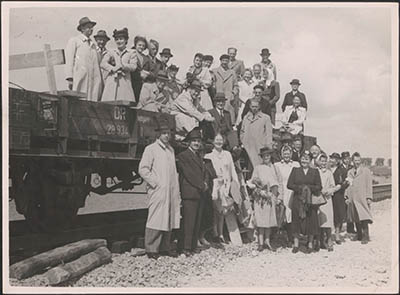Genodigden in afwachting van de opening van de spoorbrug …