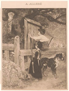 Prent getekend door August Allebé van een kind met hond