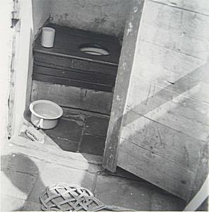 Een oud houten toilet in het pand aan de Zomerhof