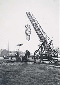 Plaatsing van een klok met reclame voor Ames Esso op de …