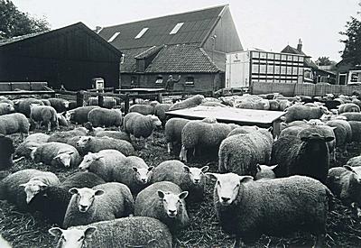 Boerenerf met schapen en veewagen te Dubbeldam