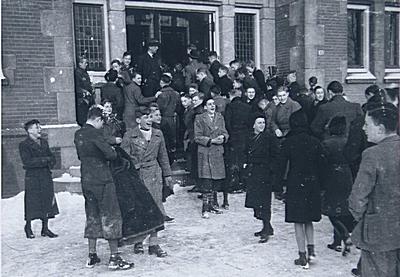 Leerlingen in de sneeuw bij de ingang van de HBS aan het …