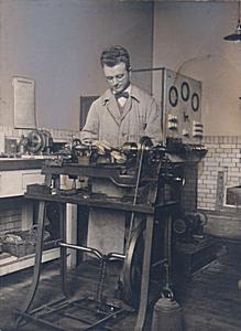 Amanuensis J.P. van Egmond aan een draaibank in de HBS …