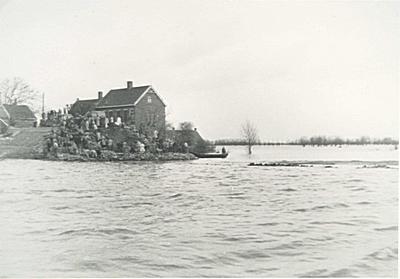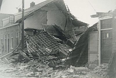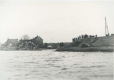 Door de watersnoodramp ingestorte huizen aan de Veerweg …