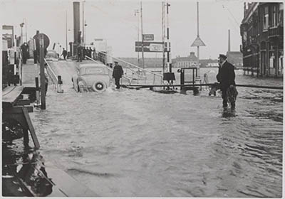 Hoogwater op het Blauwpoortsplein en het Zwijndrechts veer.