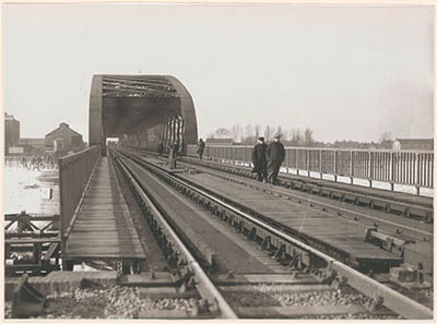 Voetgangers maken gebruik van de spoorbrug over de Oude …