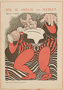 Spotprent van de zanger Jos. M. Orelio als Hamlet.
