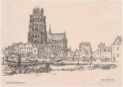 Gezicht op Dordrecht ter hoogte van de Groothoofdspoort.