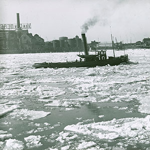 IJsbreker op de Oude Maas met op de achtergrond pakhuis …