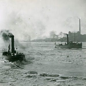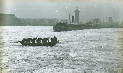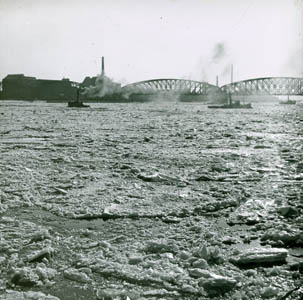 IJsbrekers in de Oude Maas. Op de achtergrond de …
