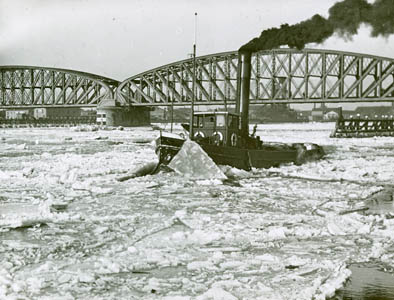 Een ijsbreker op de Oude Maas nabij de spoorbrug.