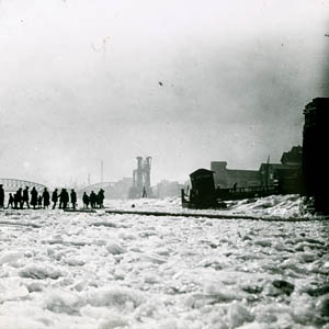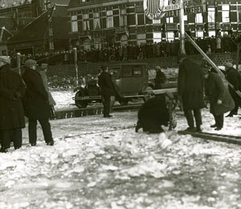 Overtocht van voetgangers over de dichtgevroren Oude Maas …