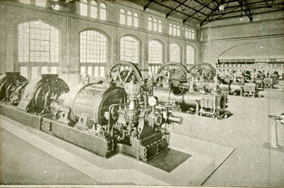 Machinezaal met turbine (voorgrond) en zuigermachines in …