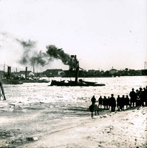 IJsbrekers op de Oude Maas. De toeschouwers staan op de …