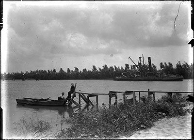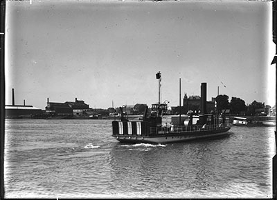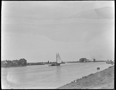 Veerboot op de Oude Maas. Rechts van het midden hotel Het …