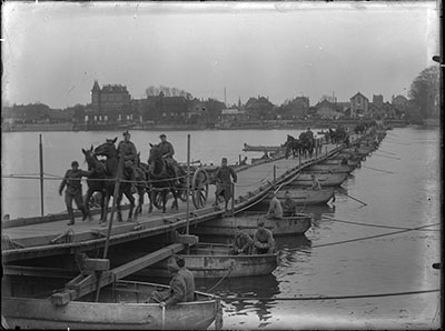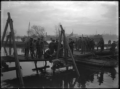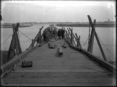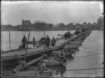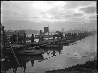 Een door pontonniers geslagen pontonbrug vanuit de haven …