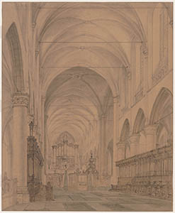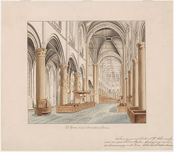 Gezicht achter de preekstoel in de Grote Kerk, c. 1850.