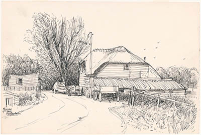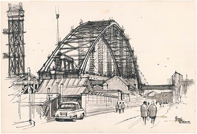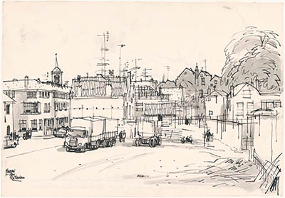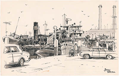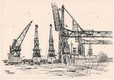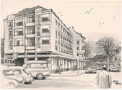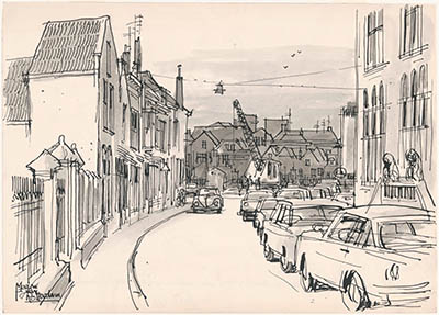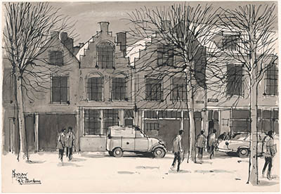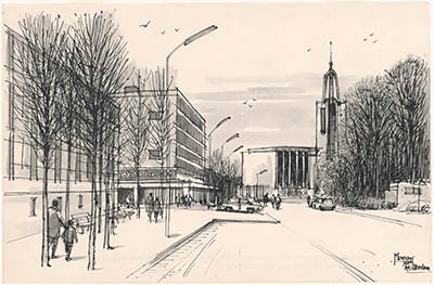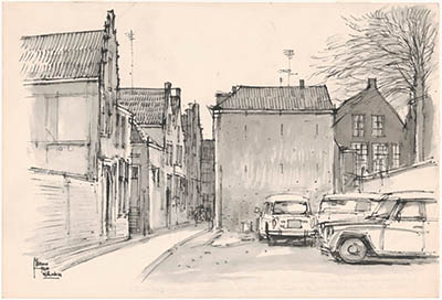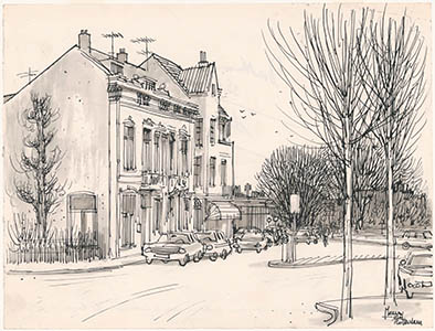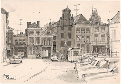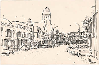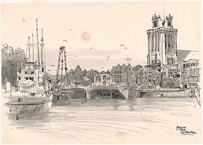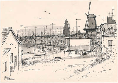 Tekening door Meeuw van Rotterdam van de Merwekade met …