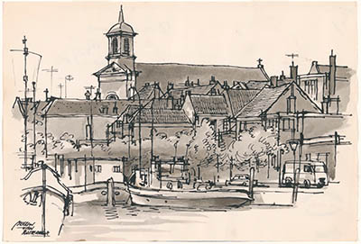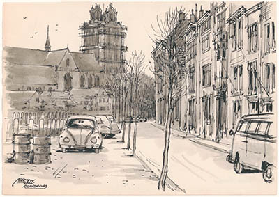Tekening door Meeuw van Rotterdam van het Weeshuisplein.