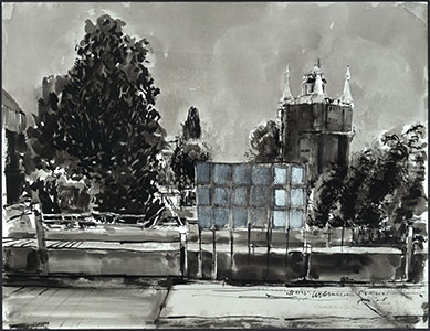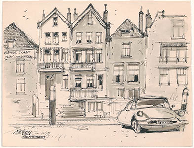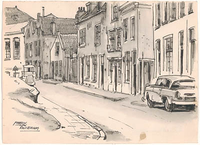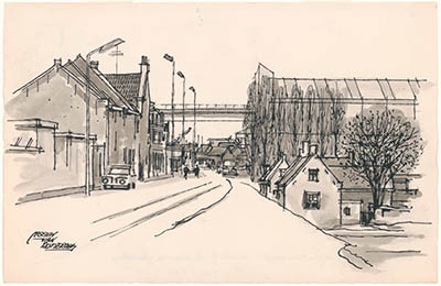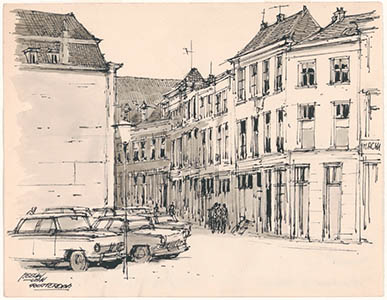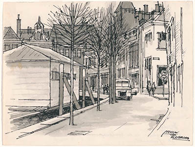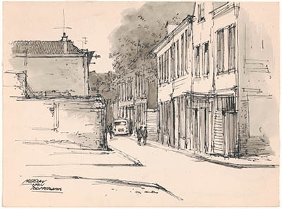 Tekening door Meeuw van Rotterdam van de Wijngaardstraat.