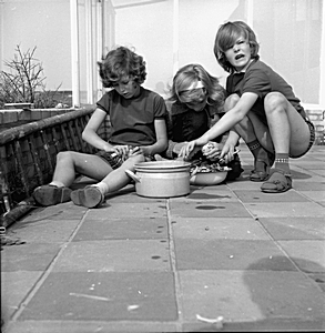 Drie kinderen schillen aardappels