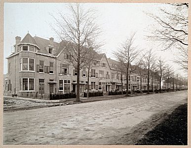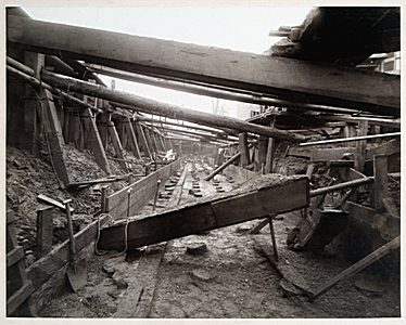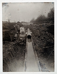 Aanleg van riolering in de Riouwstraat. Op de achtergrond …