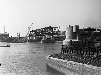 Een op de pijlers geplaatst brugdeel van de verkeersbrug …