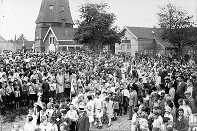 Een optocht loopt van de Vrieseweg richting Oranjelaan. …