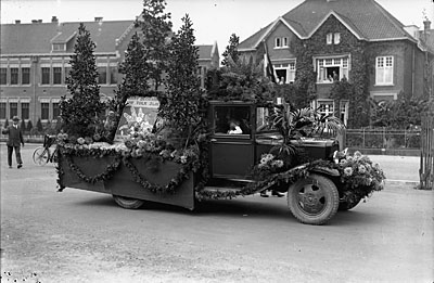 Een met bloemen versierde vrachtwagen in het Oranjepark, …