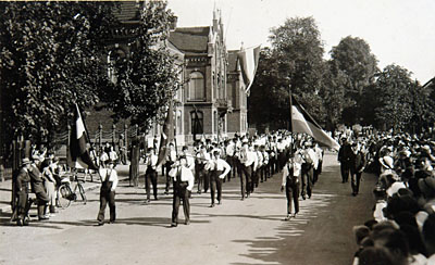 Het pijperskorps Jubal marcheert voorbij het …