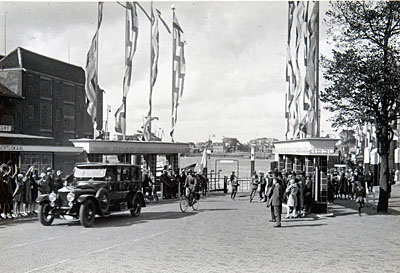 Pinksterdrukte, auto's en fietsers bij de pont aan het …