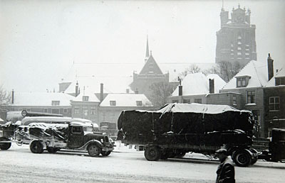 Gezicht op het besneeuwde Blauwpoortsplein waar …