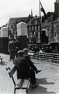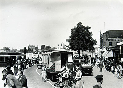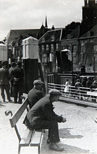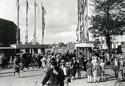 Drukte op het Blauwpoortsplein na aankomst van het veer …