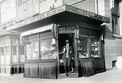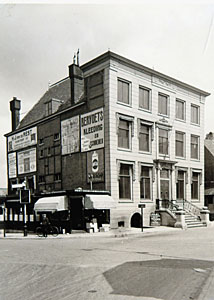 De kiosken tegen de zijgevel van de Kweekschool met de …