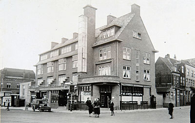Gezicht op café De Pelikaan, winkels en woonhuizen die op …