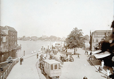 Gezicht op de kade langs het Blauwpoortsplein. De pont …