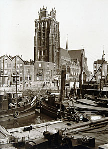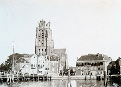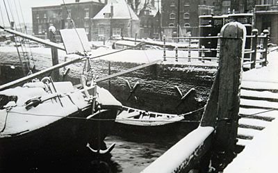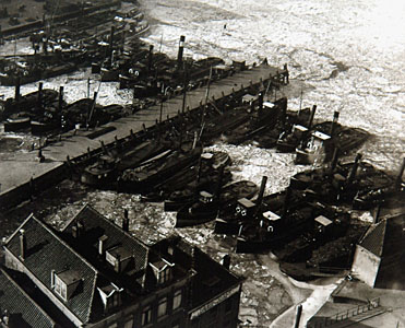 Vastgevroren schepen in de Bomhaven gezien vanaf de toren …