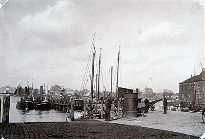 Gezicht op de oude houten steiger in de Bomhaven.