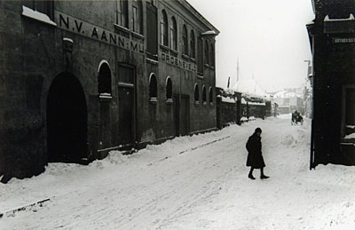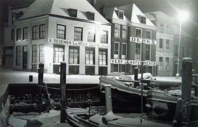 Gezicht op de Bomkade in de sneeuw. Midden zuivelhandel …