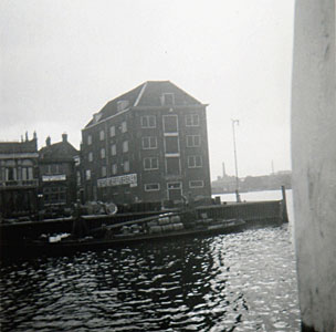 Gezicht op de Bomhaven vanaf de Leuvebrug. Links het pand …