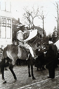 Een heraut te paard leest in de Johan de Wittstraat de …