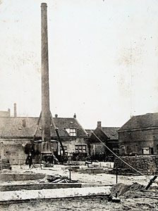 Omhalen van een fabrieksschoorsteen, waarschijnlijk aan …