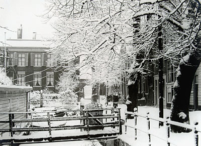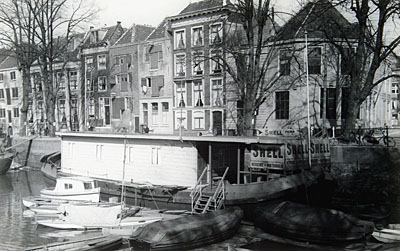 Links het Maartensgat met een woonboot, in het midden de …