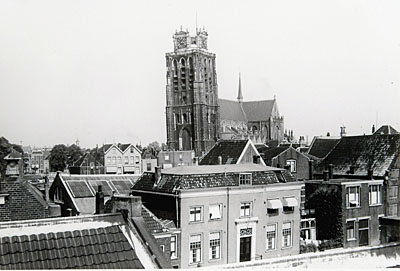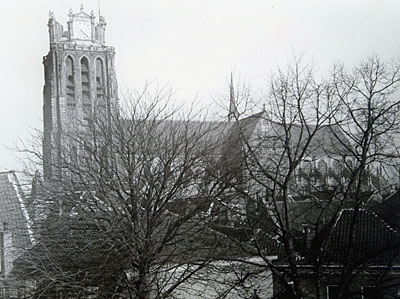 De Grote Kerk vanaf van een dak aan de Kalkhaven gezien.